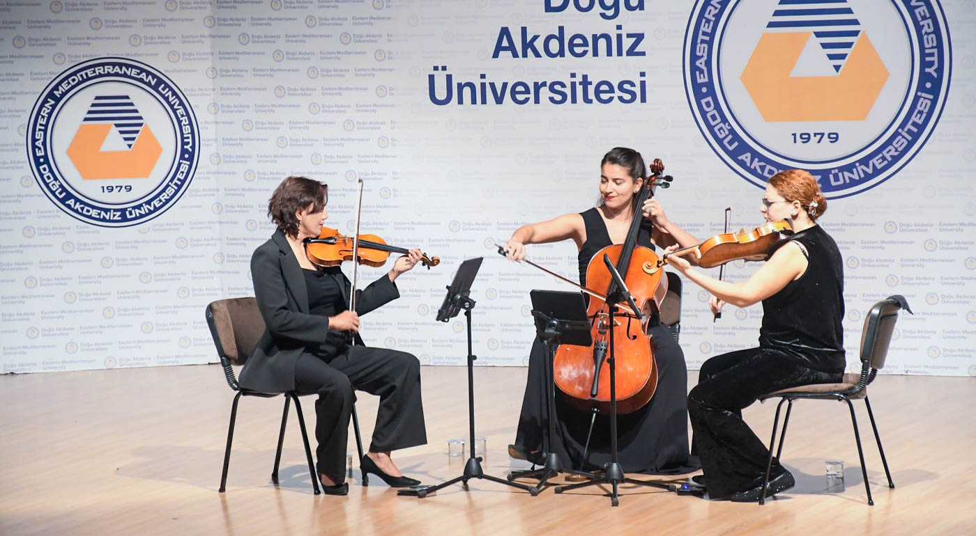 Following the opening speeches, Prof. Dr. Kılıç presented exhibition curator Ateşin a plaque of appreciation. Prof. Dr. Kılıç also presented certificates of appreciation to Dr. Uluçay and artists who took part in the exhibition. EMU Culture and Arts Week continued at Activity Center with a classical music recital by Myhhra Trip.