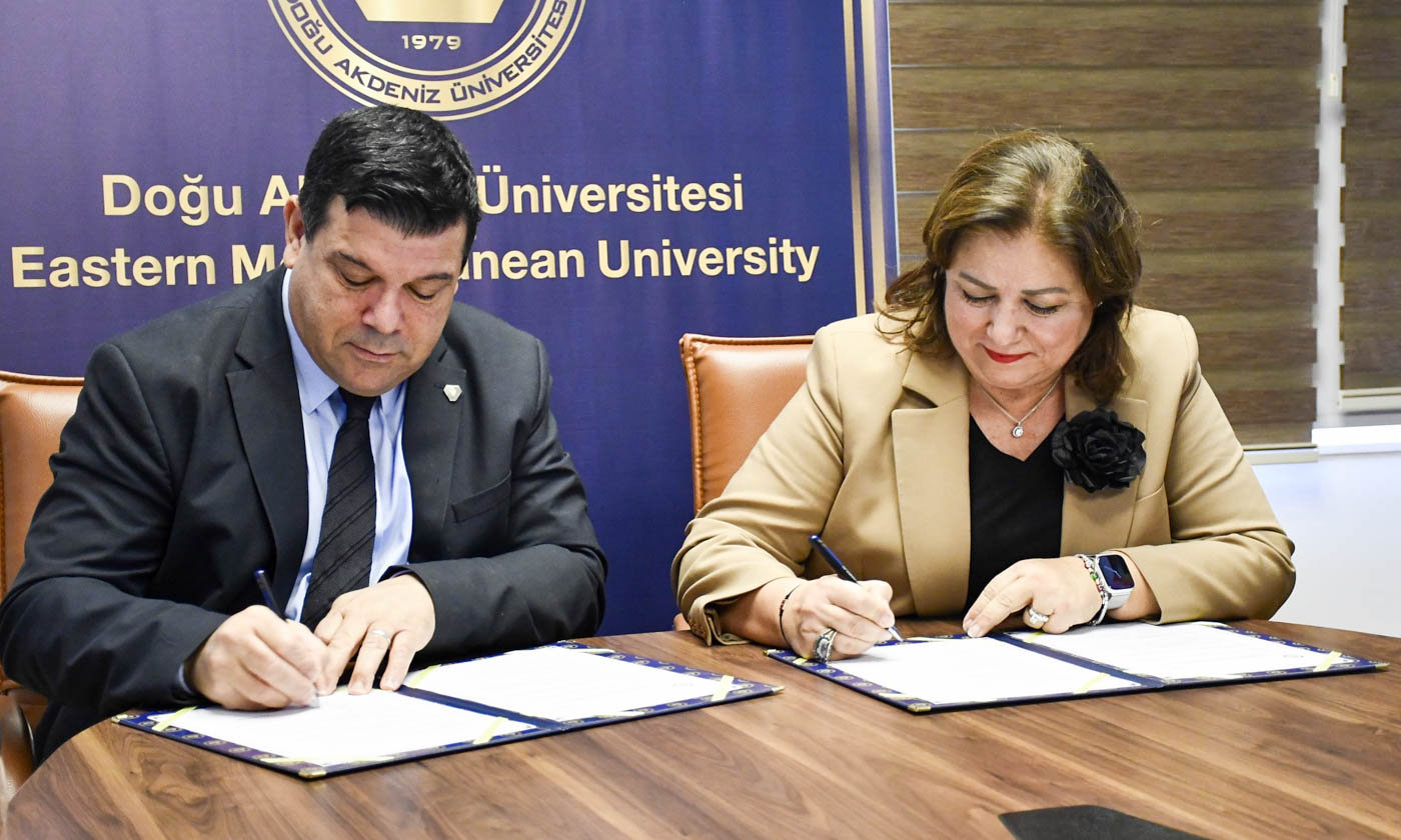 Eastern Mediterranean University (EMU) and Oğuz Özyalçın Foundation signed a collaboration protocol on providing scholarships for students of EMU. Signed by EMU Rector Prof. Dr. Hasan Kılıç and Eser Özyalçın – Founding Board of Trustees Member of the Oğuz Özyalçın Foundation. The signing ceremony took place at EMU Rector’s Office. As part of the protocol, successful EMU students who face financial struggles will receive “Oğuz Özyalçın Student Support Scholarship”. Present during the signing session were, EMU Vice Rector for Student Affairs Prof. Dr. Sonuç Zorlu, Chair of EMU Community Involvement Center (CIC) Assist. Prof. Dr. Nazenin Ruso Kandemir, EMU Rectorate Private Secretariat Director Kazım Hakverdi and, Oğuz Özyalçın Foundation Board of Trustees Member Eşber Andıroğlu.