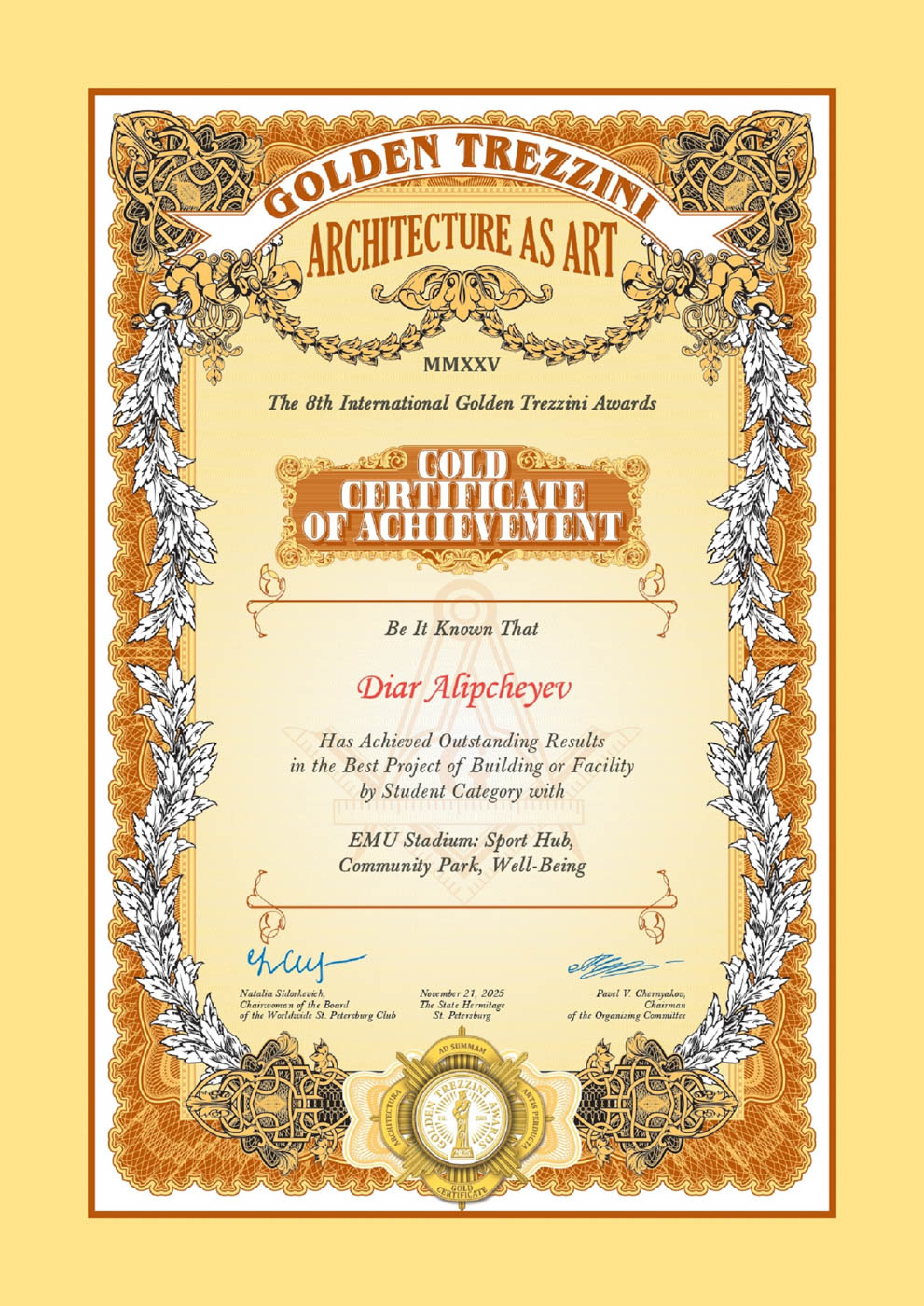 Eastern Mediterranean University (EMU), Faculty of Architecture, Department of Architecture 2025 graduate Diar Alipcheyev achieved great success, receiving two significant certificates at the Golden Trezzini Awards International Competition. Alipcheyev received a Gold Certificate for the stadium project he designed for the EMU Campus as part of the 4th Year Design Studio (ARCH 491). In addition, his graduation project titled “Revitalization through Art and Culture: Integrating Creative Spaces into the Urban Fabric” was awarded a Silver Certificate.