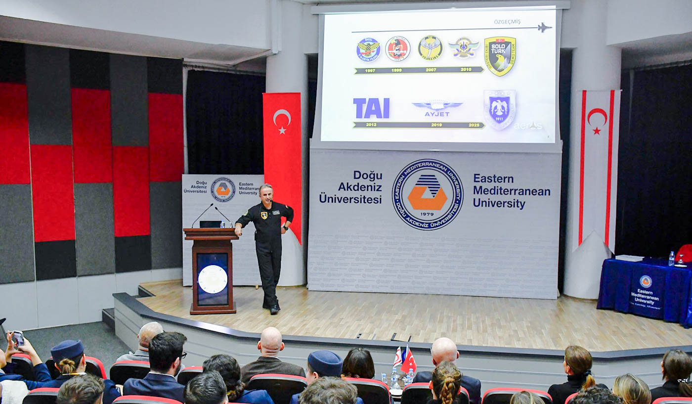 Tourism Club and Faculty of Tourism operating under Eastern Mediterranean University, Student Development, Activities and Sports Affairs Directorate co-organized a talk event titled “SoloTürk Kuruluş Hikayesi ve İlham Yolculuğu / Founding Story of SoloTürk and A Journey of Inspiration”. The talk event feature Col. Murat Keleş – Founding Leader of SoloTürk and first ever air show pilot. Held at Mustafa Afşin Ersoy Hall, the said event was also attended by EMU Vice Rectors Prof. Dr. Osman M. Karatepe and Prof. Dr. Ali Öztüren, EMU Faculty of Tourism Dean Assist. Prof. Dr. İlkay Yorgancı, Vice Deans and many students.