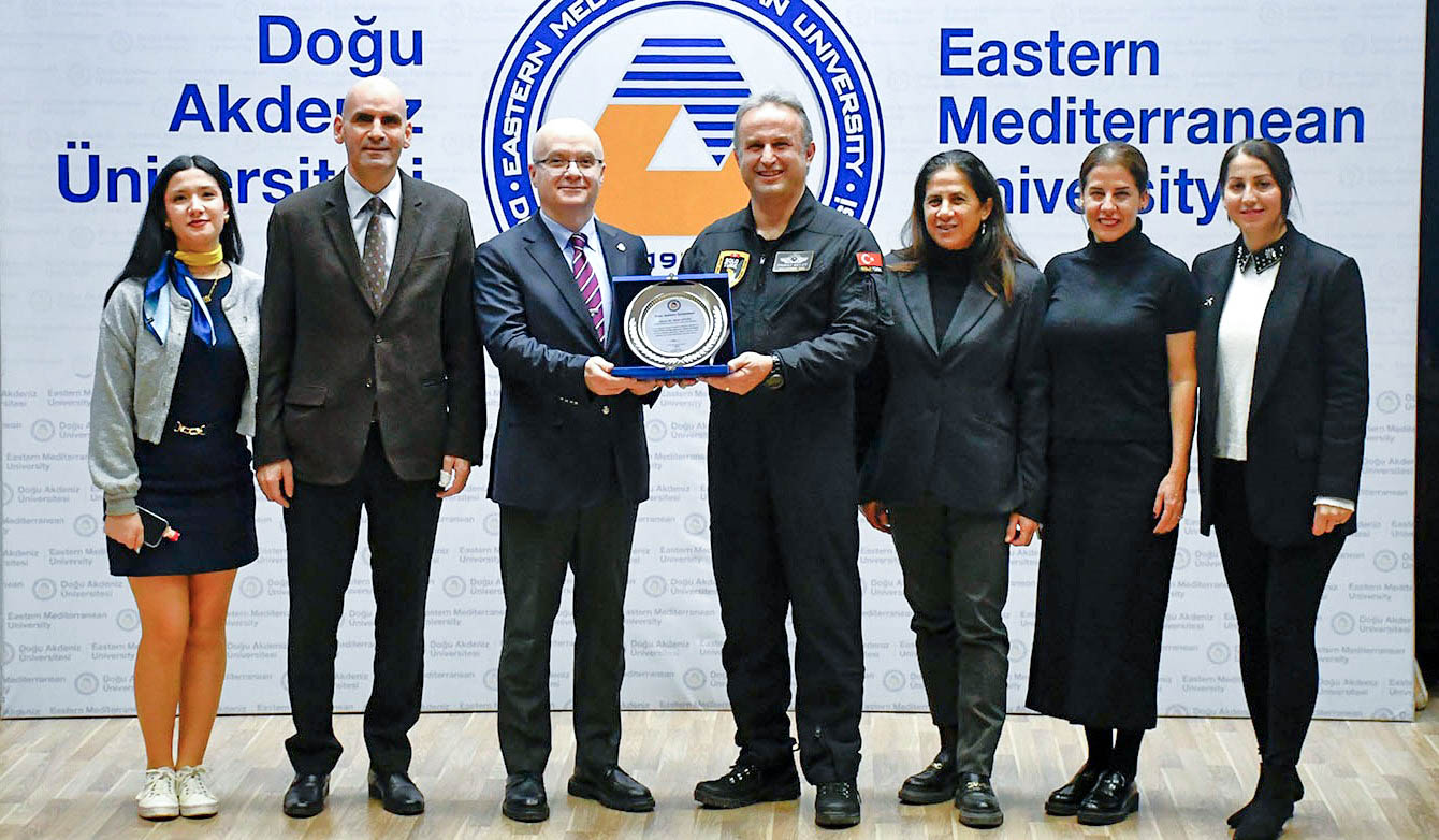 During the talk, Col. Murat Keleş, the founding leader and first demonstration pilot of SoloTürk – a team established within the Turkish Air Force and recognized as a national symbol at both national and international levels – shared insights into the team’s formation and his inspirational journey with the audience. The event concluded with Prof. Dr. Karatepe presenting Col. Keleş with a silver plate in recognition of his contributions.